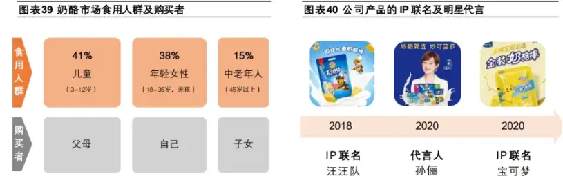 2018 年,公司与知名动漫 IP “汪汪队”进行联名合作,利用“汪汪队”在儿童群体中的高热度,提升品牌认知; 2020 年,公司聘请孙俪为品牌代言人,主要瞄准宝妈群体,同时携手精灵宝可梦这一在 80、90 后心中极具份量的 IP,推出金装奶酪棒。