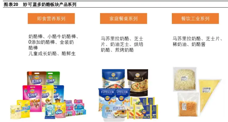 妙可蓝多产品覆盖即食营养系列、家庭奶酪系列及餐饮工业系列,包括几十款营养美味的奶酪产品。其中妙可蓝多奶酪棒、妙可蓝多马苏里拉奶酪已成为明星爆款产品。