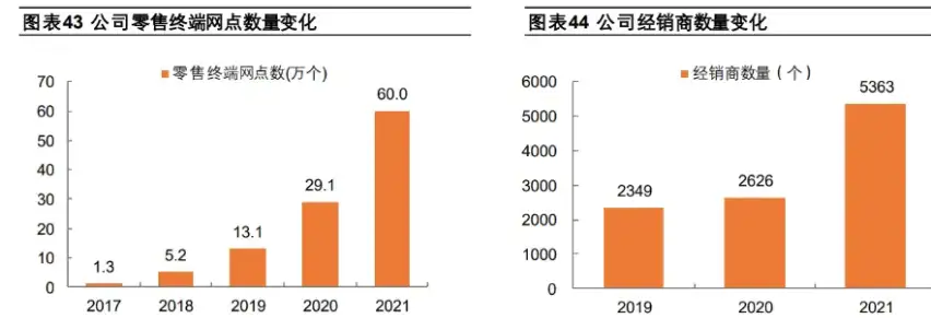 妙可蓝多在渠道拓展上采取农村包围城市的策略,即避免和国际品牌正面竞争,从二三线城市入手,积累了一定的消费者后,再反攻一线城市。2021 年,妙可蓝多零售终端网点数量及经销商数量均出现翻倍,经销渠道的营收占比已超七成。