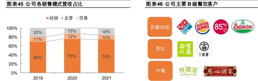 直营渠道占比稳定,贸易业务受益协同发展。直营渠道的收入来源主要是自营电商、大型商超以及餐饮客户。其中针对餐饮客户,妙可蓝多主要依托研发和产品优势,充分发挥国内领先的定制能力,为客户提供一站式解决方案。目前已经与达美乐餐饮、汉堡王、85 度 C、萨莉亚等国内大多数西快及烘焙领域头部企业,奈雪、古茗等头部茶饮企业,以及外婆家、广州酒家等知名的中餐企业展开合作。