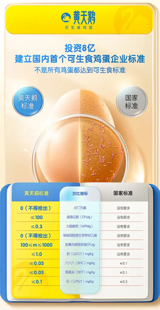 作为国内最先建立可生食鸡蛋企业标准并严格执行的企业,黄天鹅的管理体系涵盖了蛋鸡养殖生产的8大环节、24个关键控制点,形成了涵盖研发、生产、销售的从种源蛋鸡检测、饲料饮水监测、环境卫生控制、蛋鸡营养保障、鸡蛋监测评级等各环节严格标准化管控的全链路品质保障体系,确保每一枚鸡蛋都达到可生食标准。