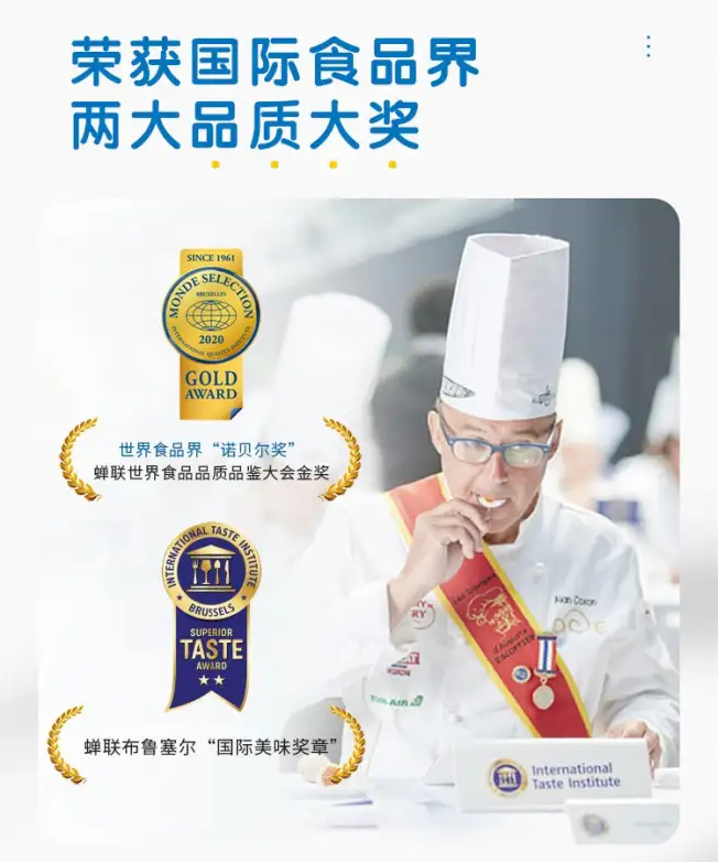 此外,通过连续三次蝉联食品界“奥斯卡”之称的国际顶级美味大奖和连续两次斩获有着食品界“诺贝尔奖” 之称的世界品质评鉴大会金奖,为品牌信任做加持。