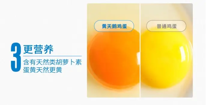 黄天鹅在饲料中增加万寿菊补充叶黄素,加深了蛋黄颜色的同时,也增加了维生素含量;为了让鸡蛋的味道更香浓,并且没有蛋腥味,黄天鹅的鸡苗口粮均为玉米大豆等纯植物蛋白。