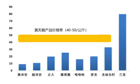 根据规格大小不同,黄天鹅每枚鸡蛋的零食终端价介于3.6-2.6元之间(线上包邮价)。对比品牌鸡蛋和蘭皇可生食鸡蛋的超高端价格(约80元/公斤),黄天鹅的定价处于行业高端,既有效的支撑了高端鸡蛋的品牌定位,又兼顾了目标人群的价格接受度,避免了蘭皇可生食鸡蛋超高定价导致了市场太小无法做出规模的问题。